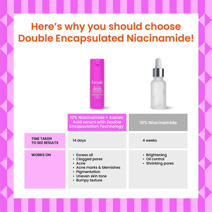 Try Foxtale’s 12% Niacinamide Clarifying Serum formulated with Double Encapsulation Technology. This inventive delivery system encloses Niacinamide in two protective layers and transports it across the lipid barrier into the targeted areas. Applying this serum ensures slow release of active ingredients that improve its efficacy.