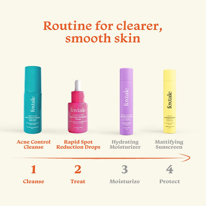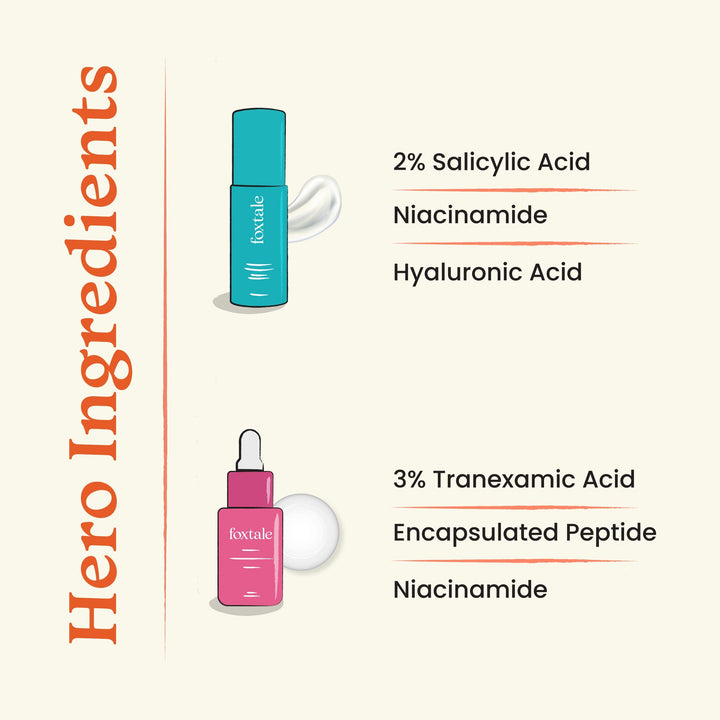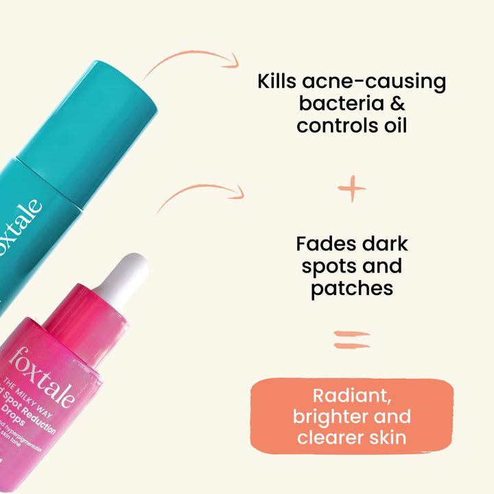 This combo fades spots and patches through controlled melanin synthesis and clears the skin from acne. It reveals an even skin tone and a smoother skin texture. Together they control excess sebum production to keep the skin clear and oil-free for a long time.