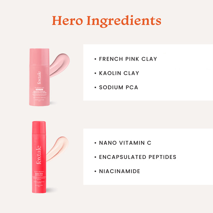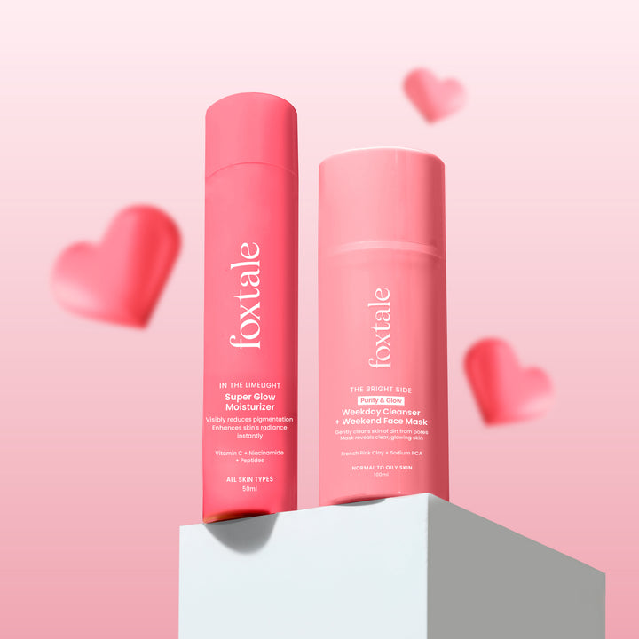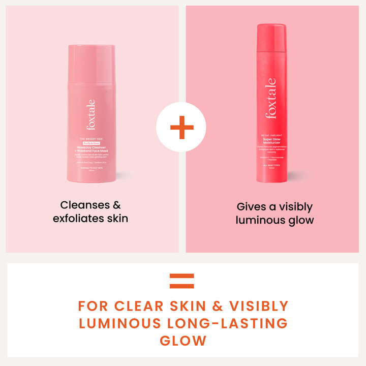 Our Purify & Glow Cleanser + Mask doubles up as a face mask to give you the benefits of both purification and exfoliation so you can get clear, glowing skin. Add the Super Glow Moisturizer to the mix. Formulated with Nano Vitamin C, which helps it sink 2x deeper into your skin to give you a long-lasting glow from the first use itself. That’s how the Super Glow Up Duo came to be.